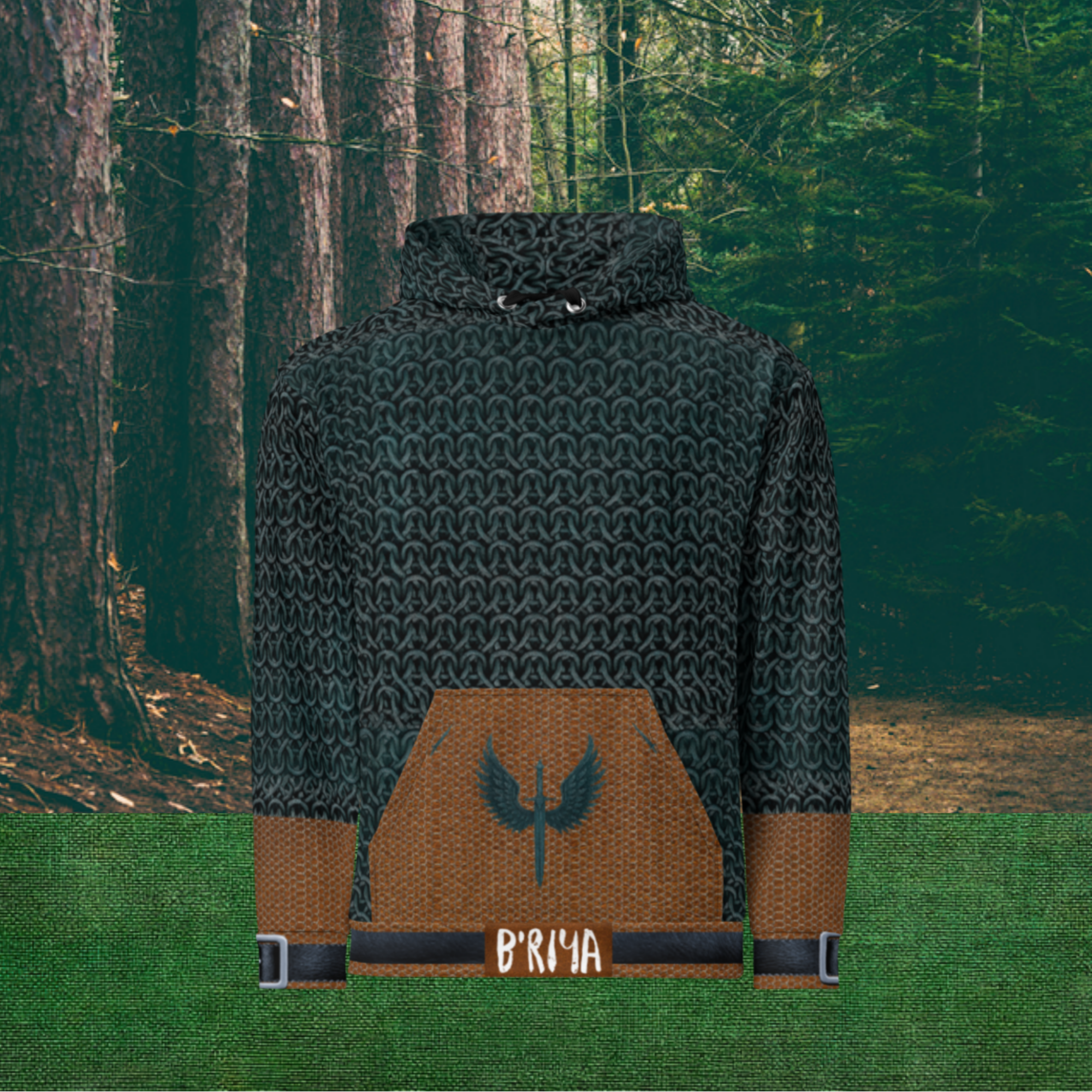 Sanctum Grid Forged with the force of relics and strength. Its mosaic of radiant blues, purples, crimsons, and greens glows like stained glass — a mark of timeless artistry. Framed by dark textures and chainmail‑like sleeves, the design recalls armor built with intention. Contrasting accents sharpen its impact, and the B’RIYA insignia seals it as a sigil of creation.
